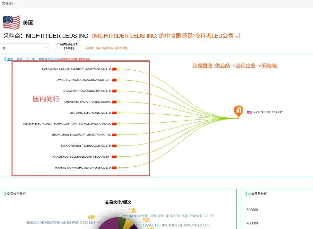当然我们在展会上获取到了很多的客户的名片,其实我们还可以通过名片去分析同行的情况,这样我们通过同行的交易记录,又可以去开发同行的客户,这个也是我比较常用的一个方法。比如这个公司NIGHTRIDER LEDS INC是我的老客户,然后通过老客户查看同行然后我们直接点击国内同行的名字,就可以直接看到同行的客户了,右边这些就都是同行的客户了,然后再通过决策人挖掘系统去挖掘到客户的联系方式,然后去联系开发就可以了,当然只是做分析的也可以,看需求。当然海关数据还有很多的作用,就不一一列举了。最后给大家分享一下我在用的这个海关数据,这个海关数据现在在做团购活动,2026年最新海关数据仅需300一年,还赠送2012-2025年的海关数据,非常的划算,每天都不到一块钱的花费,就可以有这么大的作用,真的是非常实用,建议外贸朋友人手一个。