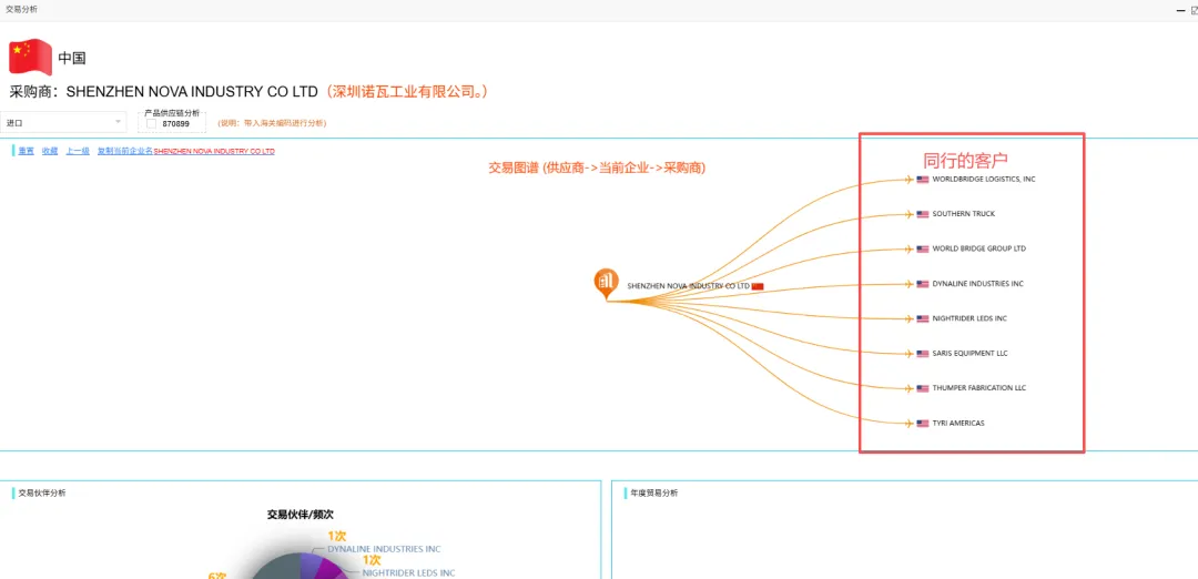 把公司名字放到深入分析里面,直接就可以看到客户的一些分析情况,比如贸易国家分析、交易伙伴分析、产品分析和年度贸易分析。