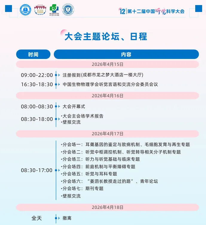 为促进我国听觉科学研究的发展,加强国内听觉研究领域专家学者的交流与合作,由中国生物物理学会听觉、言语和交流研究分会主办,四川大学华西医院、四川省人民医院联合承办,四川省耳鼻咽喉头颈外科学会协办的“第十二届中国听觉科学大会”将于2026年04月15-18日在四川省成都市召开。