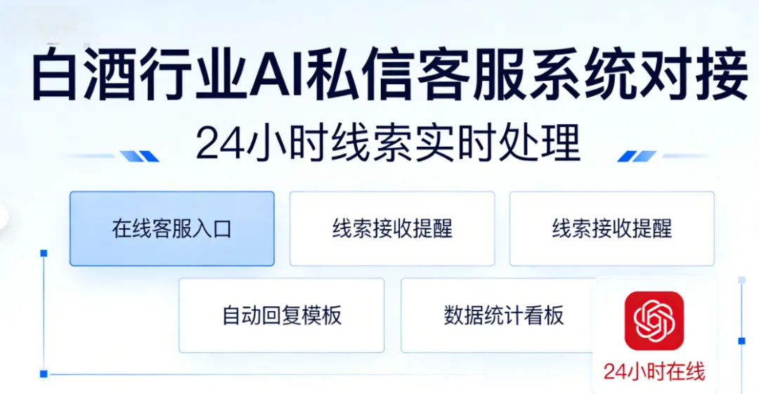 需求沟通:明确对接渠道(抖音 / 小红书 / 微信等)、线索流转规则(CRM 对接、派单逻辑)、行业话术需求。 接口配置:提供平台授权信息,技术团队 5 分钟内完成官方 API 对接。 话术与知识库搭建:配置白酒行业专属话术、价格体系、活动信息、常见问题库。 测试上线:模拟全场景咨询,验证响应速度、意图识别、线索流转效果,优化调整。 正式运行:开启 24 小时服务,启动数据监控,持续优化。