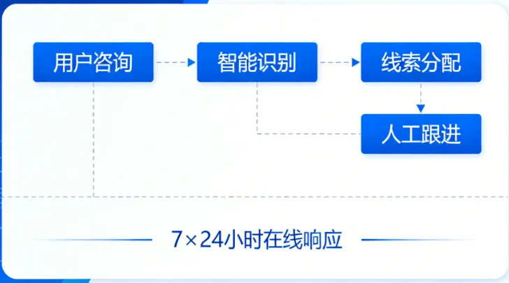 渠道分散:线索来自官网、抖音私信、小红书私信、视频号、微信公众号、投放落地页等,多平台独立管理,人工切换易遗漏。 时段覆盖不足:人工无法 24 小时在线,夜间、节假日咨询流失率高,错过黄金转化窗口。 响应慢、标准乱:人工回复速度慢(平均 > 10 秒),话术不统一,客户体验差,意向客户易转投竞品。 线索流转低效:客资手动录入 CRM,易出错、延迟,跟进不及时,导致线索沉睡。 数据难沉淀:缺乏统一数据统计,无法优化渠道、话术与投放策略。