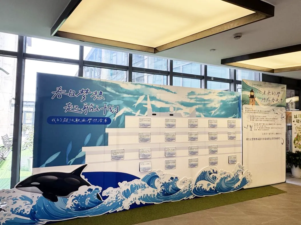 我们打造了一艘巨型轮船造型的互动展板,每一个窗口背后,都藏着一种职业的小秘密——