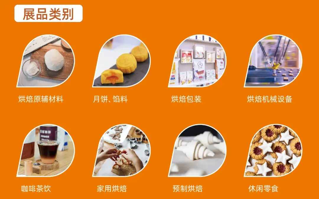 烘焙原辅料、月饼、馅料、烘焙包装、烘焙机械设备、咖啡茶饮、家用烘焙、预制烘焙、休闲零食