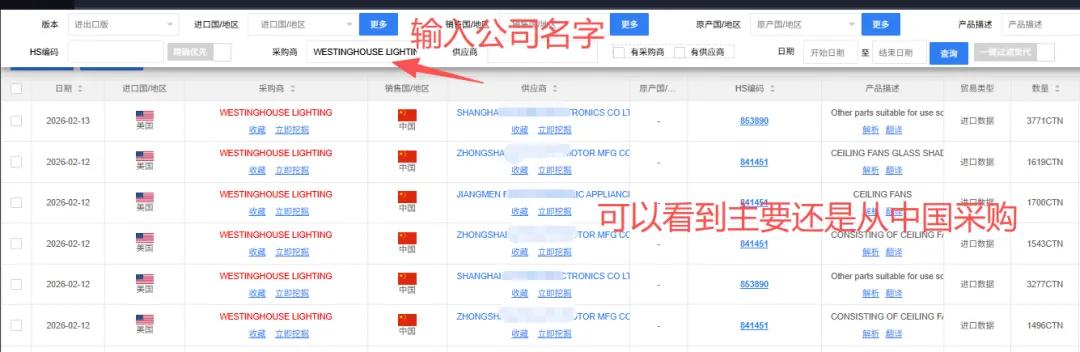 举个例子,老客户WESTINGHOUSE LIGHTING之前长期合作,但近期断单。直接把公司名输入海关数据查询,就能清晰看到:该客户仍在高频采购,且主要从中国进货,合作意愿依然存在。