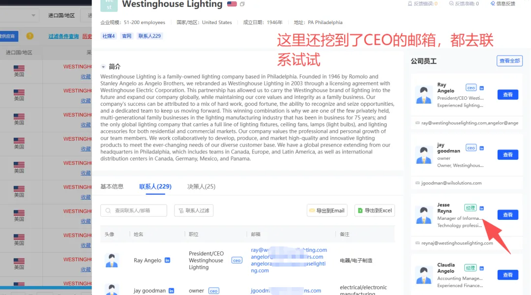 下一步就是查看采购负责人是否变动。通过决策人挖掘功能,看到了我之前联系的这位经理Jesse Reyna ,邮箱也没啥问题,就可以直接针对性邀约沟通。另外这里还挖到了CEO的邮箱,也都去发邮件试下。