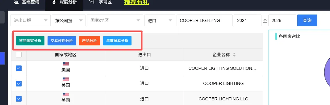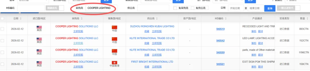 比如我在展会上收到了这个美国客户的名片和咨询,然后把客户公司名字 COOPER LIGHTING 放到海关数据里面去查询一下,确实是有采购的客户,没问题。