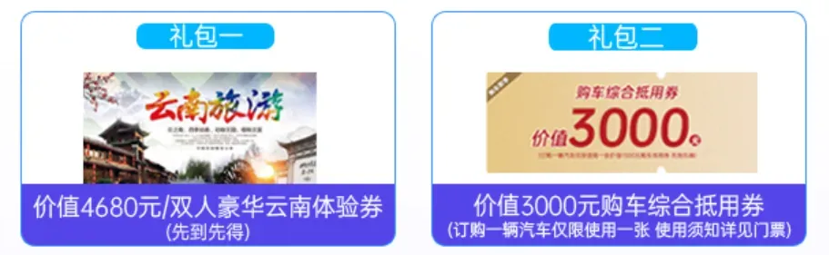 车展组委会与参展商联合释放价值千万的购车补贴,到场就送价值4680元/双人豪华云南体验券(限量)+价值3000元购车综合抵用券(订购一辆汽车仅限使用一张,使用须知详见门票)