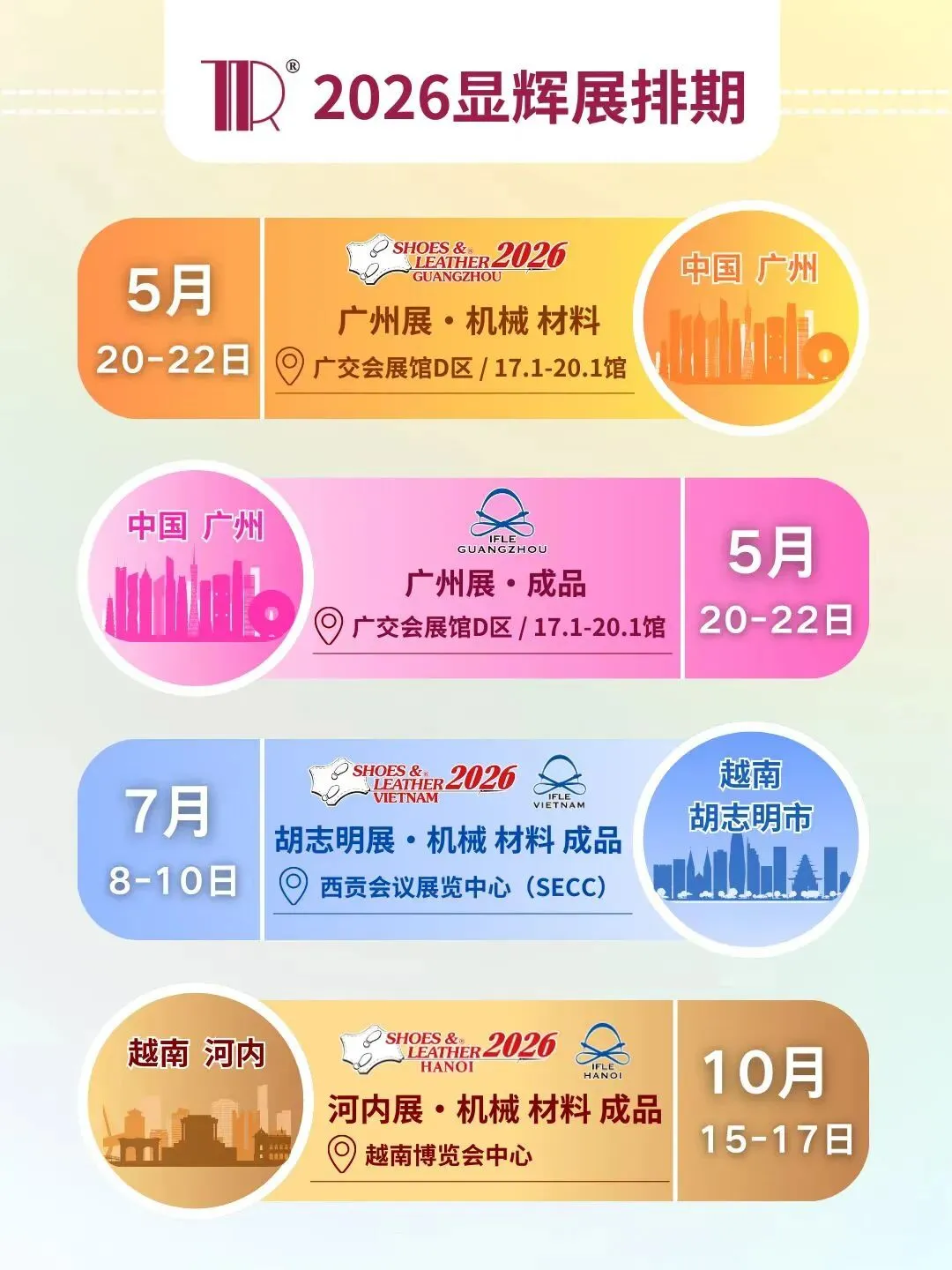 作为国际鞋类行业标杆性商贸盛会,显辉广州国际鞋革工业展为您搭建连接世界鞋业的黄金桥梁。本届展会重磅覆盖4大专业展馆,展览面积40000+平方米,汇聚行业前沿先锋展商,以全产业链阵容,定义鞋业发展新高度。
