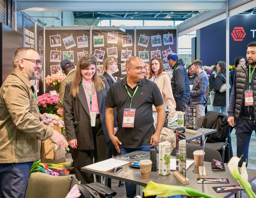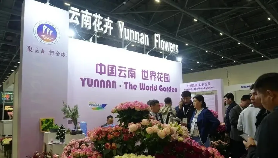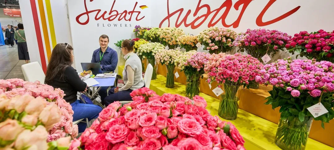 展会现场,来自世界多地的鲜切花、盆栽植物及花艺设计作品集中展出,玫瑰、百合等主流品种色彩丰富、品种多样,吸引众多专业观众洽谈选购。