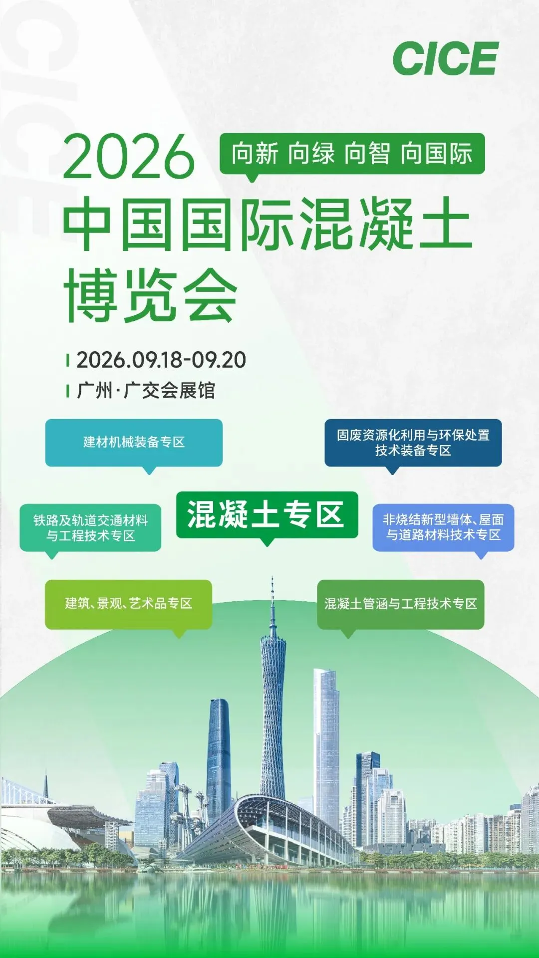 2026 中国国际混凝土博览会将于 9 月 18 日 —20 日在广州广交会展馆举办。本届展会正值中国混凝土与水泥制品协会成立四十周年与 “十五五” 规划开局之年,以 “向新・向绿・向智・向国际” 为主题,是国内规模最大、国际化程度最高的混凝土行业专业展会。