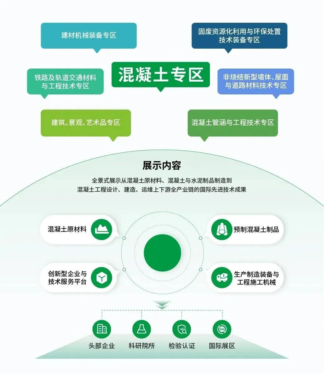 展会全面覆盖混凝土与水泥制品全产业链,集中展示新型环保原材料、高性能混凝土、智能装备及工程应用技术,服务城市更新、重大项目、新能源建设等国家战略。展会下设多个专业展区,同期举办行业大会、四十周年纪念活动、“一带一路” 国际论坛、技术赛事及采购对接会,搭建一站式商贸合作平台。