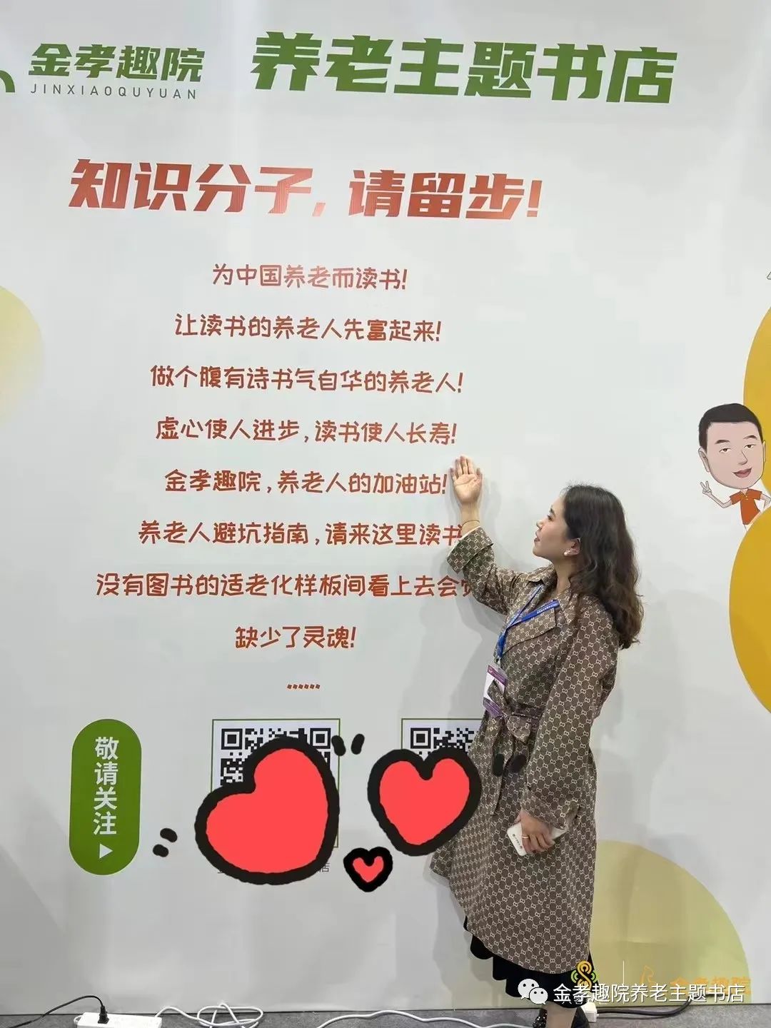 展会期间,金孝趣院养老主题书店展台十分醒目,展台里里外外都围满了观众,各路养老人群贤毕集,纷纷在展台中间打卡合影。