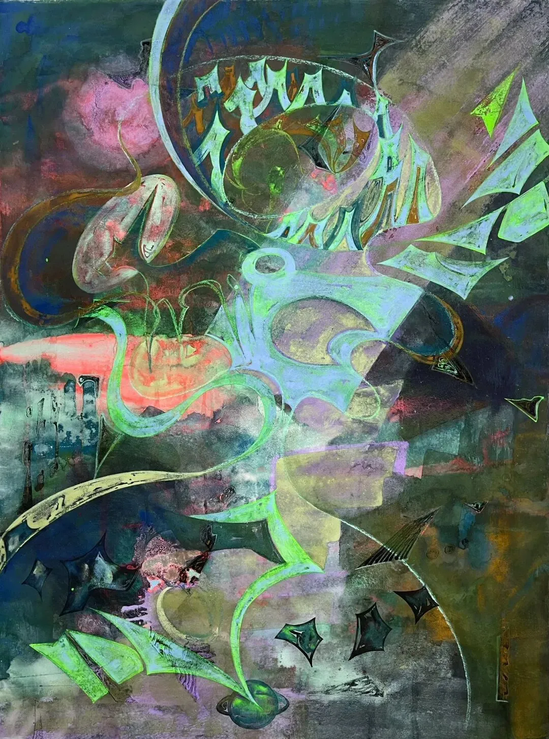 于莉莉的创作核心源于她童年时期生活在机械工厂旁的独特记忆。她将密闭空间、储罐、管道等工业化元素,与新疆克孜尔石窟的菱形格图案相结合。这种“菱形格”成为她标志性的艺术符号,不仅象征了物理空间的包裹感,也构建了她对时空和宇宙进行哲学思辨的框架。近年来,她的关注点进一步扩展至“宇宙观”与“生命能量”,通过抽象的画面探讨更宏大的主题。