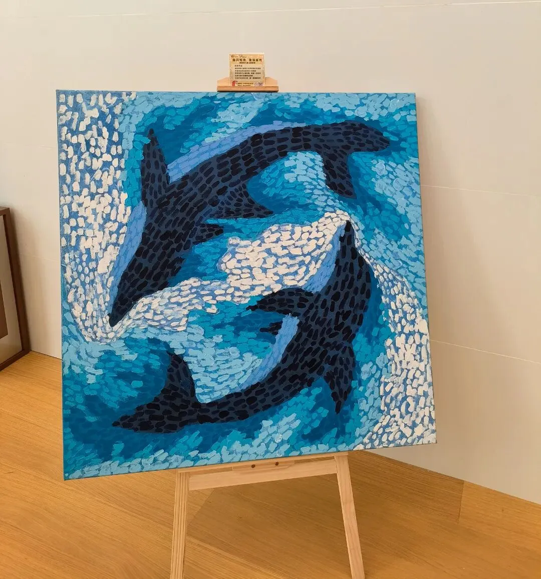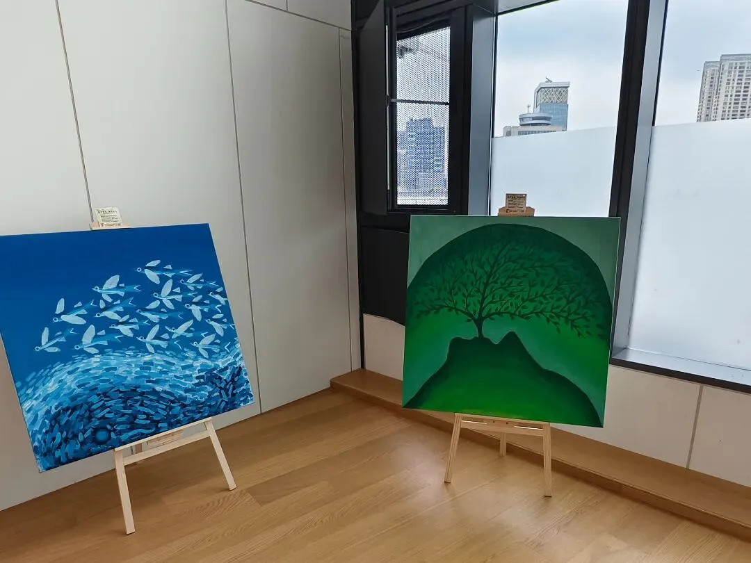 展厅内,所有作品均以 “一米高度” 陈列,兼顾儿童与轮椅使用者的观展体验,画作上的创作说明记录着画作的用心和就业实践的努力,让观众在收获美好观感的同时,感受公益的力量。