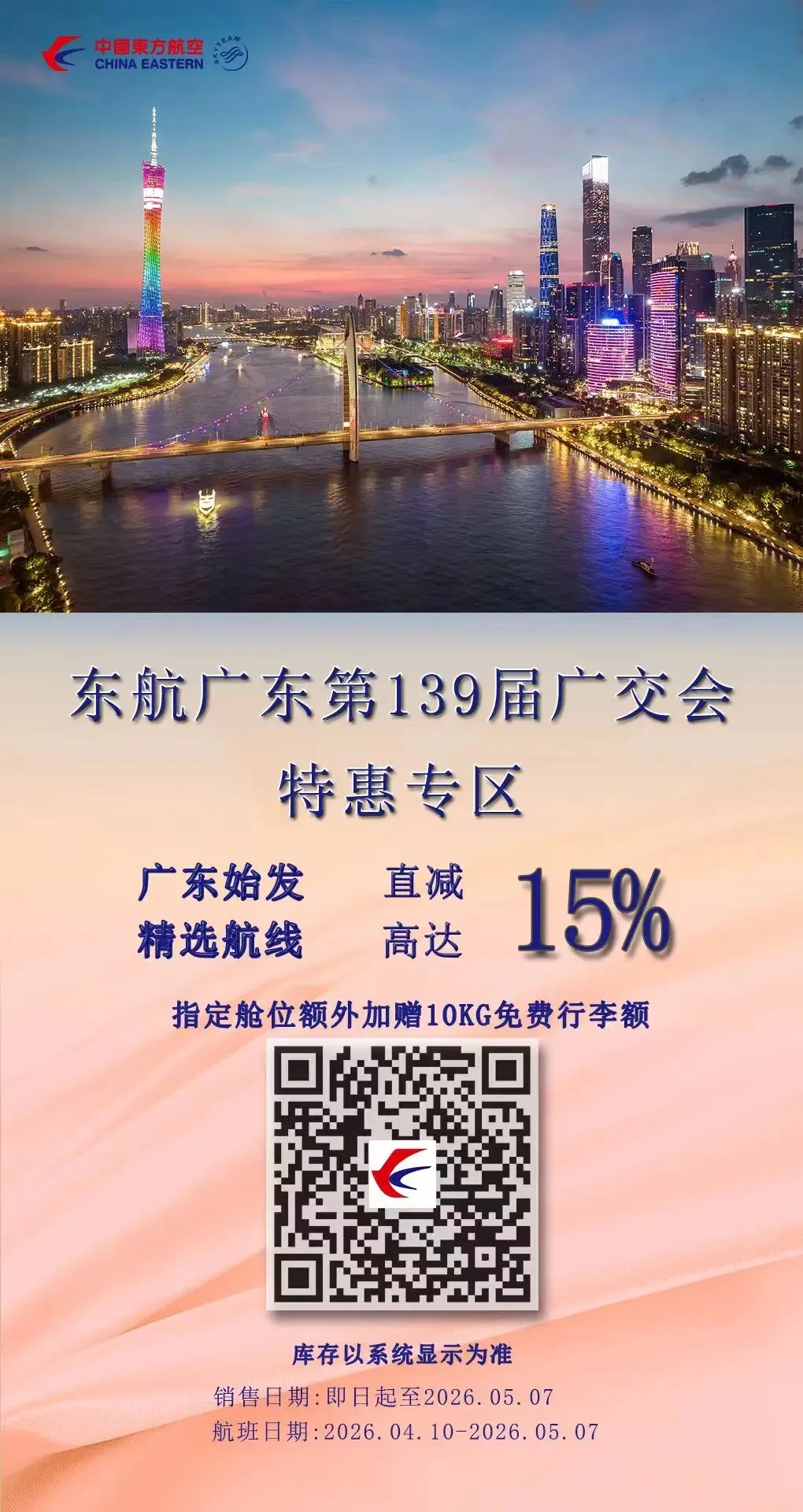 第139届中国进出口商品交易会(广交会)将于2026年4月15日至5月5日在广州盛大举办。为更好地服务全球参展商与采购商,中国东方航空聚焦广州、深圳出港航班,推出多项广交会专属出行产品和服务,全面优化参展人员的出行流程与体验,助力高效参展开启顺畅之旅。