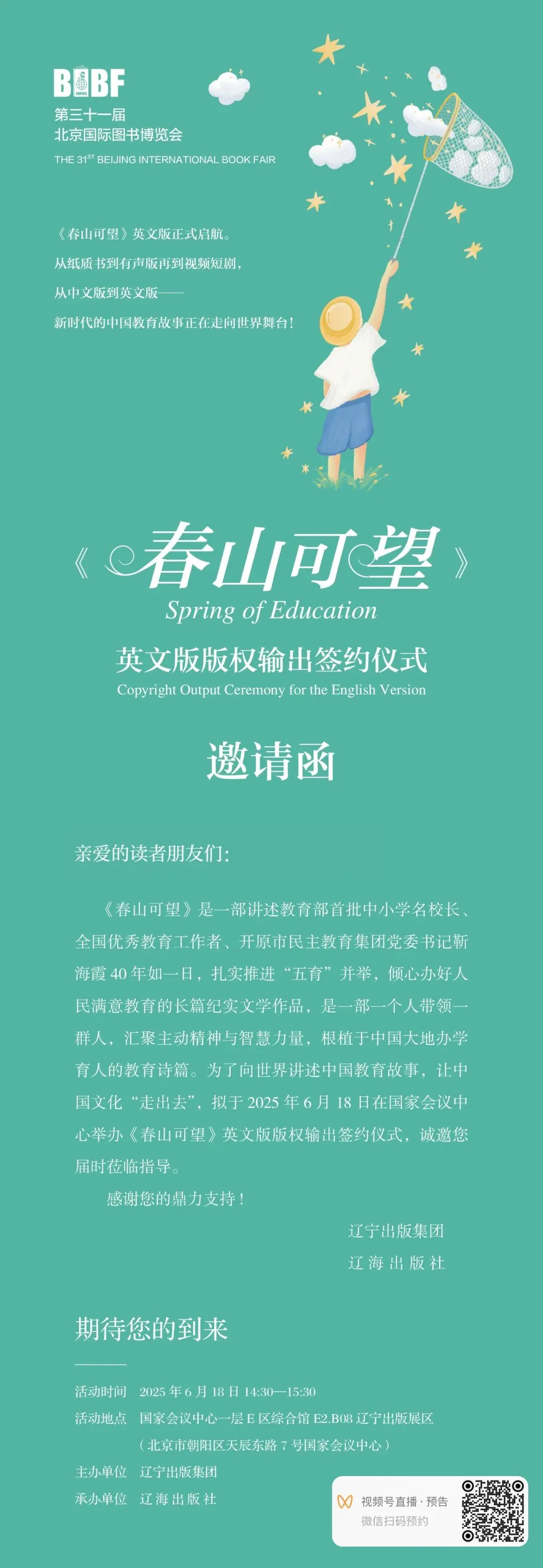 6月18日14:30-15:30,辽海出版社将在辽宁出版展区举办《春山可望》英文版版权输出签约仪式。该书由辽海出版社出版,以教育为主题,兼具文学与现实价值。此次版权输出,将中国教育故事与人文精神传递海外,是中国文化“走出去”的重要实践。届时,签约活动将会有现场直播,诚挚邀请您光临活动现场或通过直播与现场嘉宾共同见证本书乘翼展会、跨越山海的精彩时刻。
