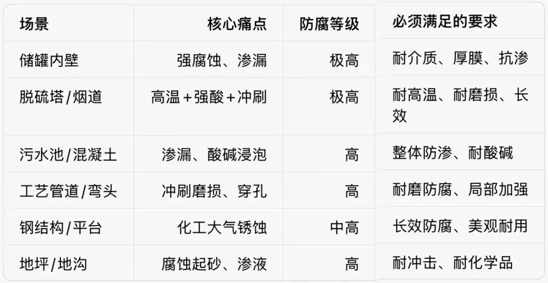 企业各项目防腐需求全景解析:环保工程、化工厂区必看,一篇看懂自己到底需要什么防腐一、先看清:你的项目,到底“腐蚀”有多严重?工业腐蚀不是简单生锈,而是三类问题叠加:• 化学腐蚀:酸碱、盐雾、废气、废水直接侵蚀• 物理腐蚀:冲刷、磨损、高温、老化、水压冲击• 隐蔽腐蚀:焊缝、死角、接口、预埋件先烂,后期爆雷凡是化工、污水、脱硫、废气、危废项目,基本都是C4~C5级重腐蚀。普通防锈漆、普通防腐漆,上去就是一年起皮、两年漏、三年大修。二、化工企业全场景防腐需求(一目了然)1. 储罐区• 腐蚀:酸、碱、溶剂、油类长期浸泡+气相腐蚀• 痛点:内壁渗漏、外壁锈蚀、罐底腐蚀穿孔• 需求:强耐介质、厚膜防腐、长期不渗不漏2. 反应釜、反应器、高温设备• 腐蚀:高温+酸碱+高压+物料冲刷• 痛点:普通涂层鼓包、脱落、粉化• 需求:耐高温、抗腐蚀、抗冲刷、长效稳定3. 工艺管道、泵阀、弯头• 腐蚀:浆液冲刷、气液两相、介质腐蚀• 痛点:弯头3~6个月磨穿,管道频繁维修• 需求:耐磨+防腐双重防护,局部加强4. 钢结构、平台、支架• 腐蚀:化工大气、酸雾、潮湿、粉尘• 痛点:2~3年锈穿,维修成本高• 需求:整体长效防腐,一次施工多年省心5. 污水池、地沟、地坪、设备基础• 腐蚀:酸碱积液、渗滤液、化学品洒落• 痛点:混凝土酥松、开裂、渗漏、异味难控• 需求:整体防渗防腐,耐酸碱耐冲击三、环保公司接项目:必须懂的防腐刚需环保项目=高腐蚀集中营,防腐选错,项目直接翻车。1. 污水处理工程• 调节池、中和池、生化池、沉淀池、污泥池• 核心问题:pH波动大、高盐、污泥磨损、硫化氢腐蚀• 必须做到:防渗、耐酸碱、耐磨损、耐浸泡2. 脱硫脱硝项目• 吸收塔、烟道、烟囱、浆液箱、循环管道• 核心问题:高温酸雾、浆液高速冲刷、露点腐蚀• 必须做到:耐高温、耐强酸、抗冲刷、厚膜防护3. 废气处理项目• 洗涤塔、喷淋塔、RTO/RTO、净化塔• 核心问题:酸碱废气、喷淋冲刷、高温热震• 必须做到:耐湿、耐酸碱、耐温、结构稳定4. 危废 / 固废处理• 渗滤液池、暂存间、焚烧炉、渣坑• 核心问题:复杂混合腐蚀、高毒高盐、强渗透性• 必须做到:超强防腐抗渗,杜绝二次污染四、一张表看懂:你项目该用什么防腐五、重点:为什么这些场景,都适合用活化高分子重防腐涂料?上面所有场景,虽然工况不同,但本质需求高度一致:耐酸碱、耐浸泡、耐高温、抗冲刷、抗渗、长效、少维修。活化高分子重防腐涂料,就是为这类极端工况量身打造:1. 一站式覆盖化工储罐、反应釜、管道、污水池、脱硫塔、钢结构、地坪……一套体系,全场景适配,不用东拼西凑。2. 真正扛得住强腐蚀解决渗漏、起皮、脱落、穿孔等常见痛点。3. 厚膜成型,一次到位尤其适合弯头、喷淋区、焊缝等薄弱部位。4. 长期省心,综合成本更低减少停机、返工、环保处罚风险。5. 适配环保工程合规要求环保公司接项目、做验收、过检查,防腐一步到位,不留隐患。六、结语不管你是化工企业做设备维护,还是环保公司总包工程项目:• 先看腐蚀环境• 再定防腐等级• 最后选择对应重防腐方案极端腐蚀工况,不用纠结材料种类,直接选择专业、成熟、经过项目验证的活化高分子重防腐涂料,活化高分子重防腐涂料,实现物理屏障+主动防腐+自修复三重防护,适配严苛腐蚀环境。#13230033830特点:底中面合一,一遍成型;环保性能好,附着力强,致密度高,耐酸碱盐等多种介质侵蚀,适用于各个基材上!