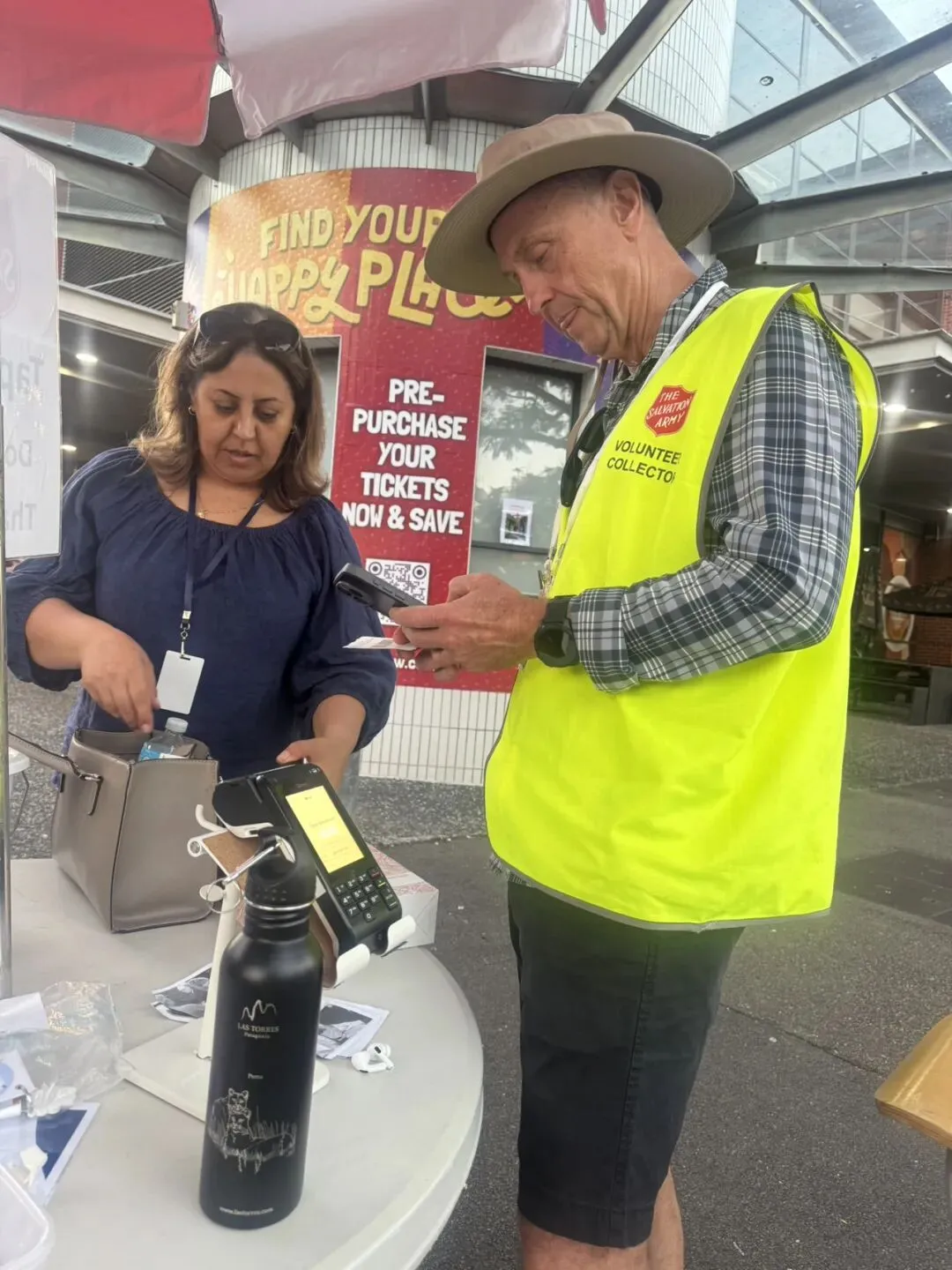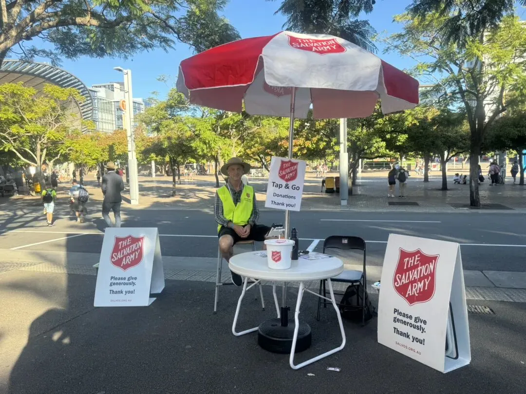 穿上一件印有救世军标志的荧光背心,