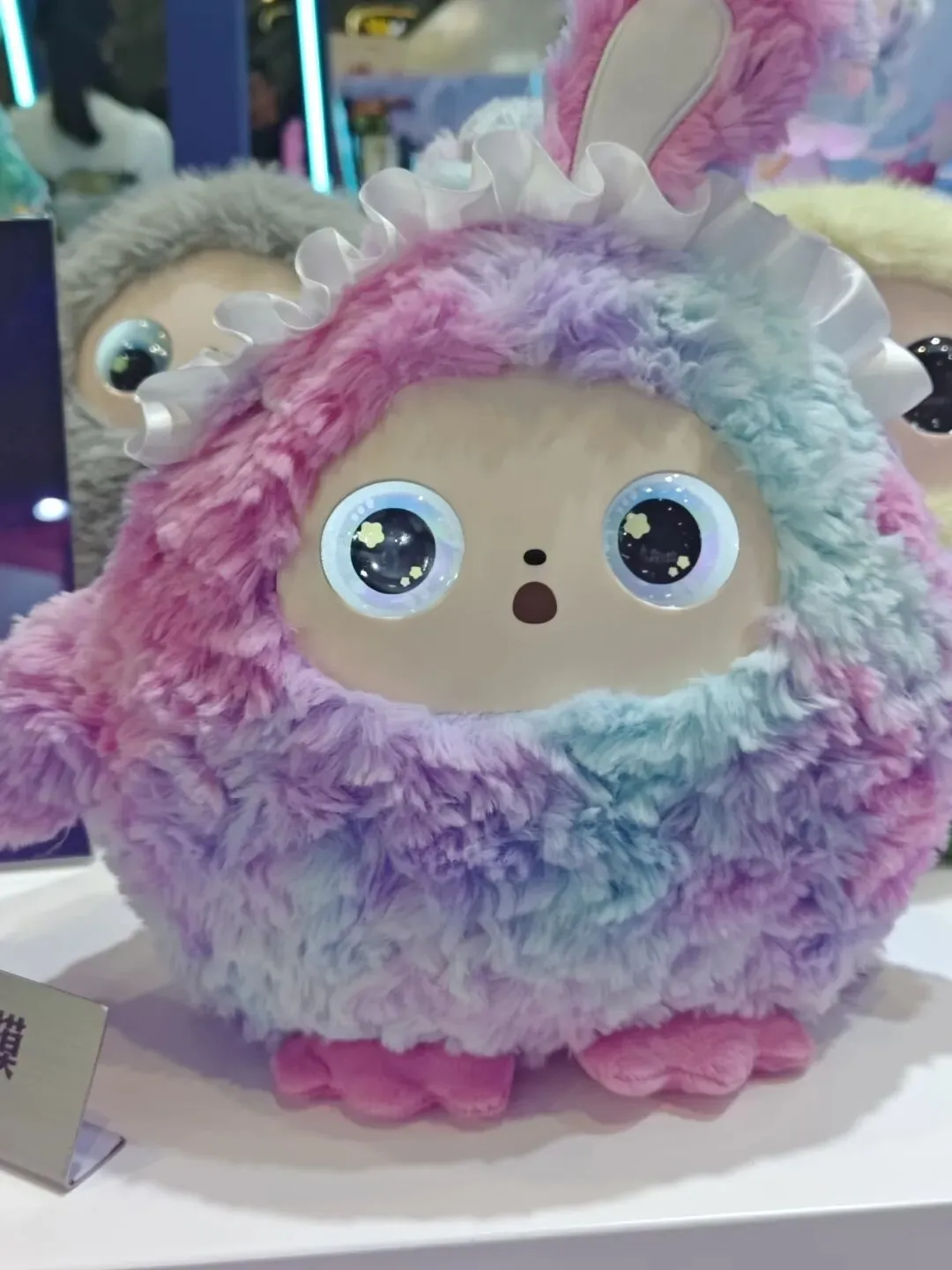 这个是AI智能陪伴玩偶,比较特色的是眼睛会动,眼球上下左右灵巧滑动,而且眼睛做得活灵活现而不显得恐怖。这种AI智能玩偶应该还有语音功能,没有仔细了解过。