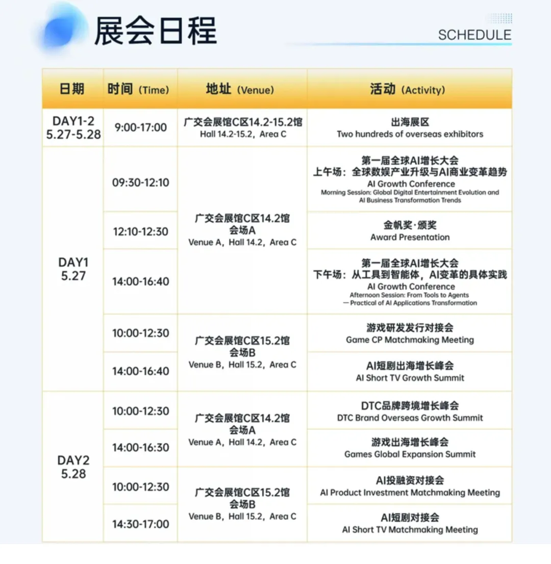 本届展会聚焦Al+、AI短剧&漫剧、游戏、电商、泛娱乐等垂直赛道;一站式对接全球支付、AI算力、流量、技术、营销、物流等出海全链路供应商;AI for Growth,从增长到变现,让我们一同在智能变革中撬动全球确定性回报!诚邀每一位出海生态的构建者与前行者共聚广州。展会连开2天,逛展需要门票,还没票的要抓紧预约了!为助力高效逛展,小编整理了逛展指南,收藏这篇,轻松逛展不迷路!