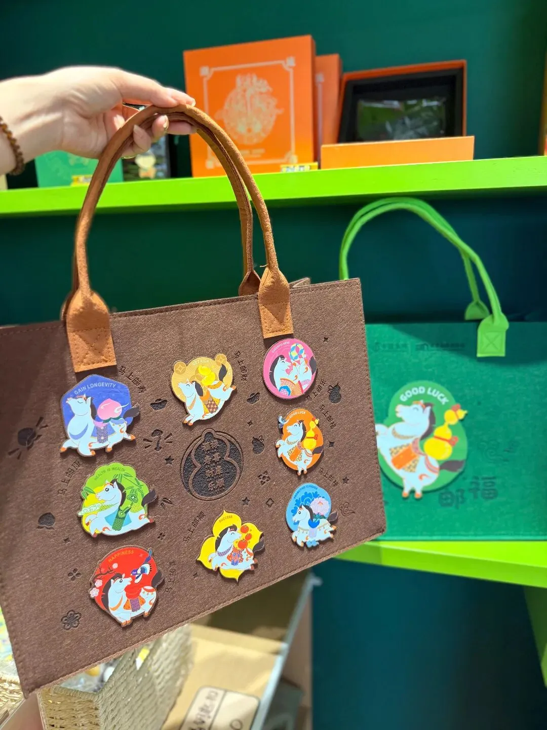 马年主题毛毡手提袋:两款配色各有韵味!印着跃动的“马上邮福”卡通马,搭配“GOOD LUCK”字样,活力满满,精致的小马贴饰,“招财纳福”“喜乐安康”等吉祥语环绕,不管是装随身物品还是当作拍照道具,都超吸睛!