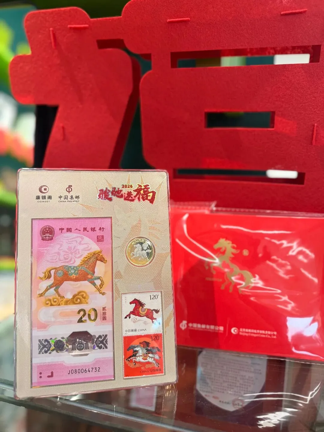 骏驰送福纪念套装:集邮与收藏爱好者必入!包含2026马年纪念钞、小巧的马年纪念币,还有两枚主题邮票,纸币上的骏马栩栩如生,邮票设计灵动喜庆,“骏驰送福”的寓意,承载着对新一年顺遂无忧的期盼。