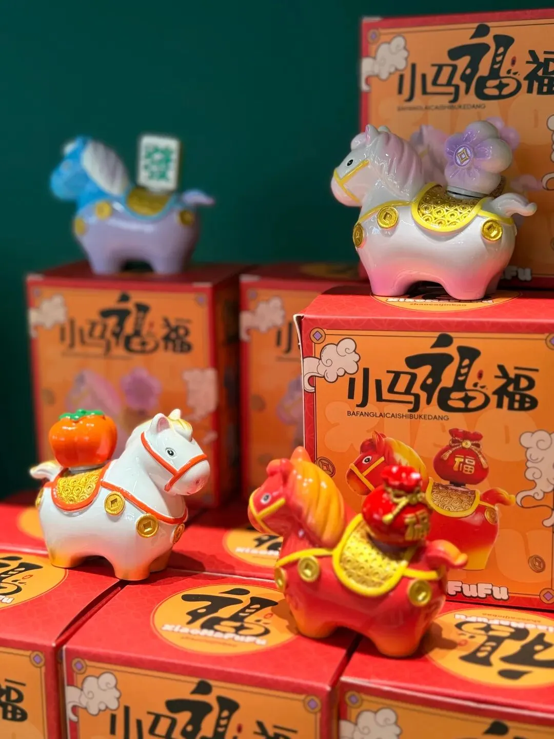 小马福福萌趣摆件:六款小马摆件各有巧思!黄蓝马驮元宝(马上财运来)、蓝紫马配“发财”牌(马上发大财)、白金马驮柿子(马上有好事)、白粉马携花朵(马上有钱花)、红金马背福袋(马上有福气),白蓝马背铜钱(马上赚大钱),小巧精致,摆放在店里、家中,处处都是吉祥氛围。