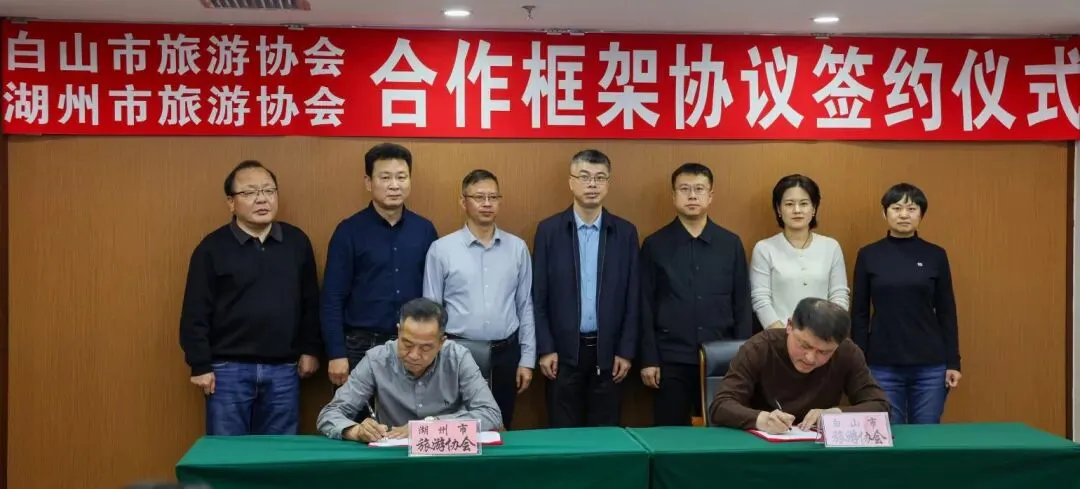 活动现场,白山市围绕生态康养、避暑休闲、边境风情、乡村旅游等核心资源,重点推介春夏季文旅产品,长白山万达国际度假区、长白山华美胜地度假区等重点文旅主体依次亮相,推介优质度假产品与精品线路,为两地企业对接搭建了高效平台。在全体与会嘉宾见证下,白山市旅游协会与湖州市旅游协会现场签订游客互送框架协议,标志着两地文旅合作正式迈入常态化、机制化发展新阶段。