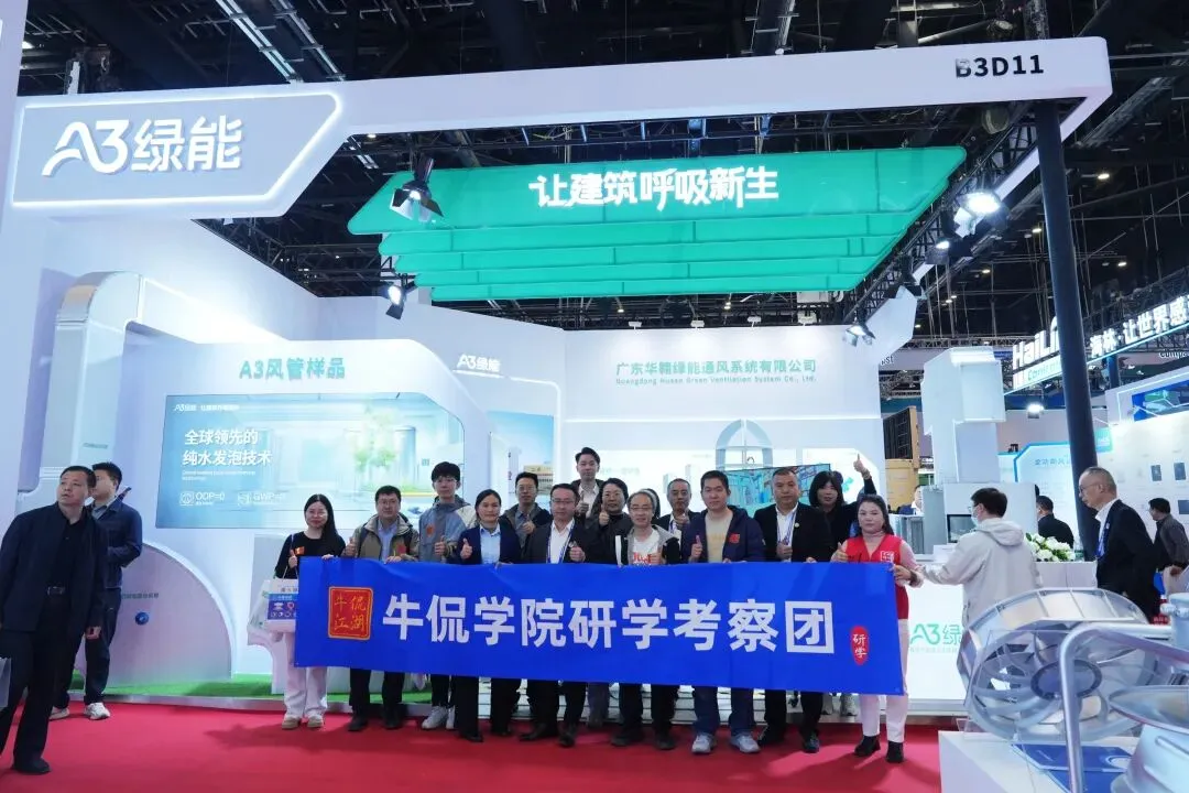 展会期间,牛侃学院研学考察团一行专程到访华翱绿能展位。作为行业知名的研学平台,牛侃学院始终关注前沿技术与国产创新成果。考察团成员认真观摩了A3绿能复合风管的实景展示,详细了解了纯水发泡技术的核心优势与全产业链布局。双方就绿色通风系统的教学推广、技术培训等方向进行了深入交流,为后续产学研合作奠定了良好基础。