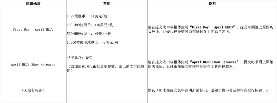 请在提交表中注明所需标签、标注和/或发行标识。如提交表中未注明特殊标签或发行标识,则纪念币将获得标准标签或未标注发行标识的描述。