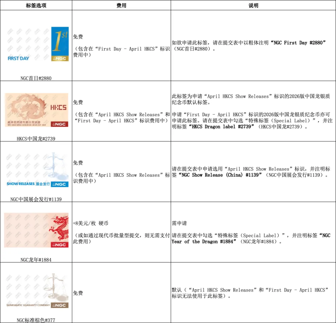 NGC亦为本次展会现场发售的2026版中国龙银币提供下列特殊标签以搭配上述发行标识: