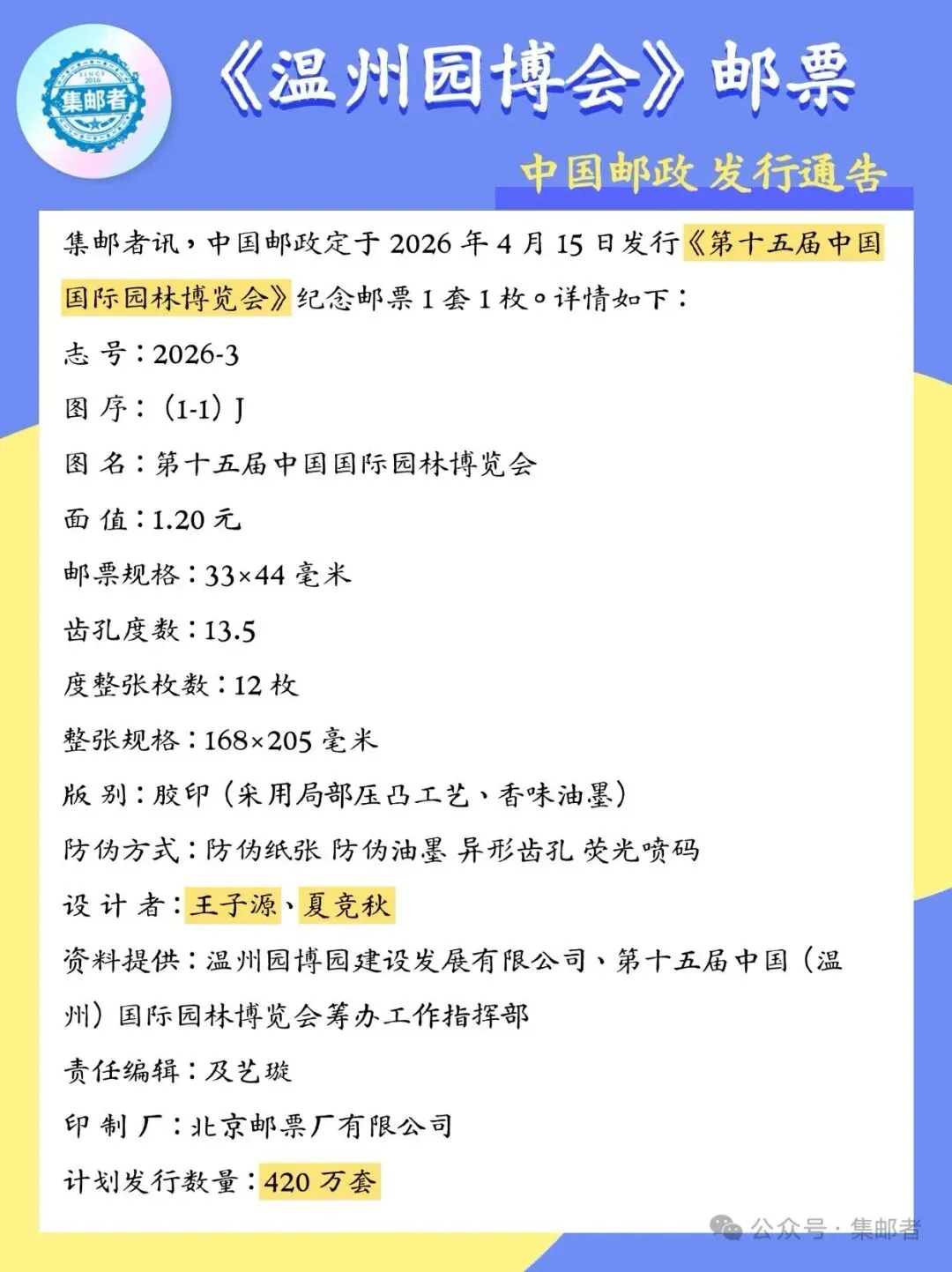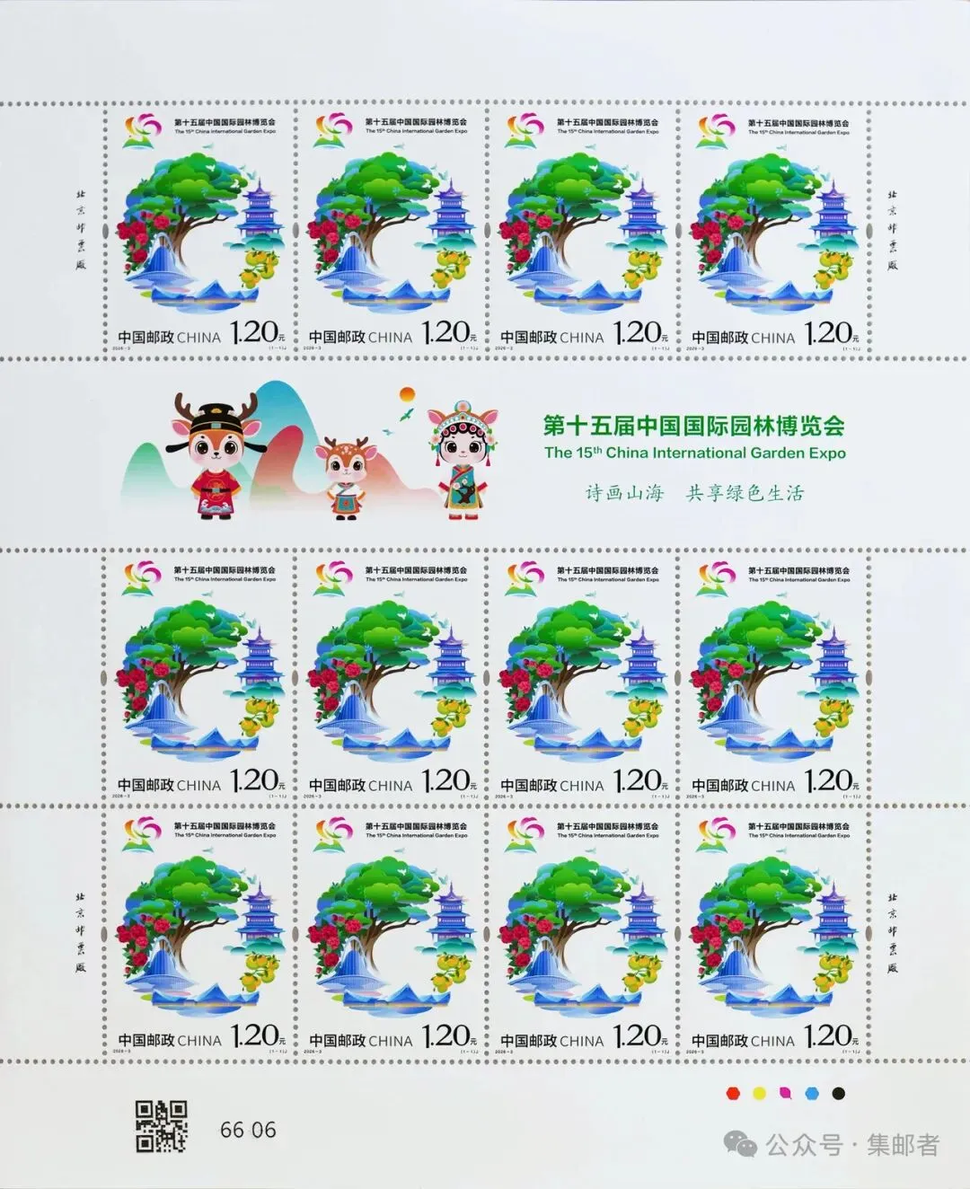 资料如下:中国邮政定于2026年4月15日发行《第十五届中国国际园林博览会》纪念邮票1套1枚。邮票图案名称为:第十五届中国国际园林博览会。全套邮票面值1.20元。计划发行数量为420万套。