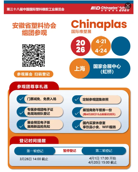第三十八届中国国际塑料橡胶工业展览会“CHINAPLAS2026国际橡塑展”将于4月21-24日在上海国家会展中心召开,本届展会,我会有众多优秀会员单位或集团公司参与展出,现将会员单位展位号公布如下,如有意向合作,可赴展会现场洽谈。同时,我会将组织会员赴会参观,主办方将给予我会会员VIP待遇,如有意向报名,请扫描下方图片二维码,同时秘书处提供酒店代订服务,主办方将派遣班车往返酒店和展馆之间,为我会会员提供接送服务。
