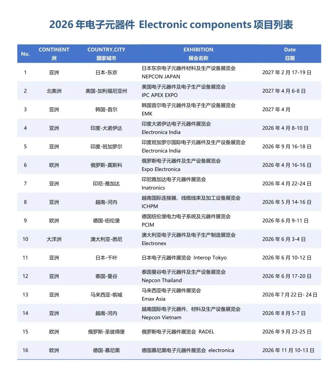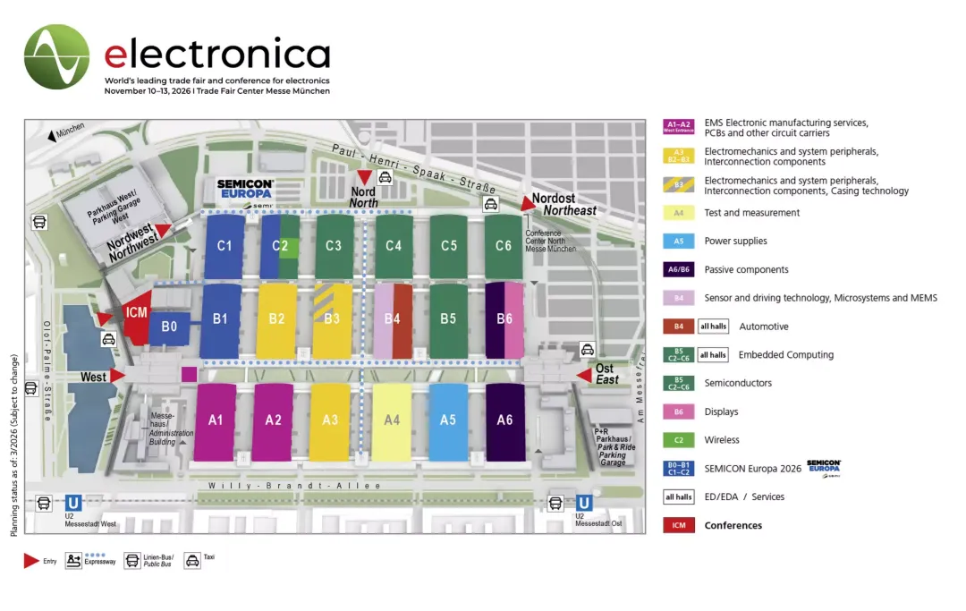 electronica 2026 设立16大核心展区,覆盖电子元器件全产业链: