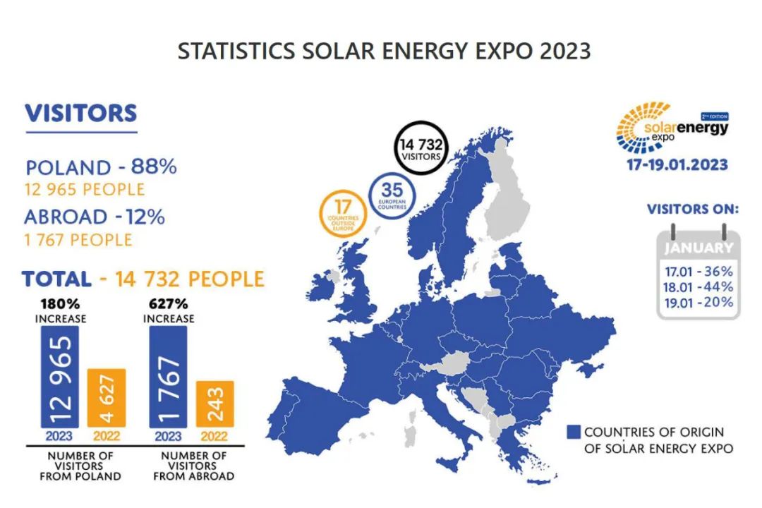该展览是国际买家广泛参与的一个国际性洽谈平台。2023年一月波兰华沙能源展汇聚了一百五十多家欧洲和北美等地国际展商,14000多名行业专业人士参加了此次展会。国内展商有:华为、艾伏,、LONGQI 等。