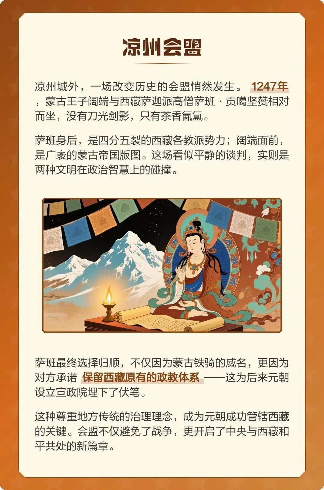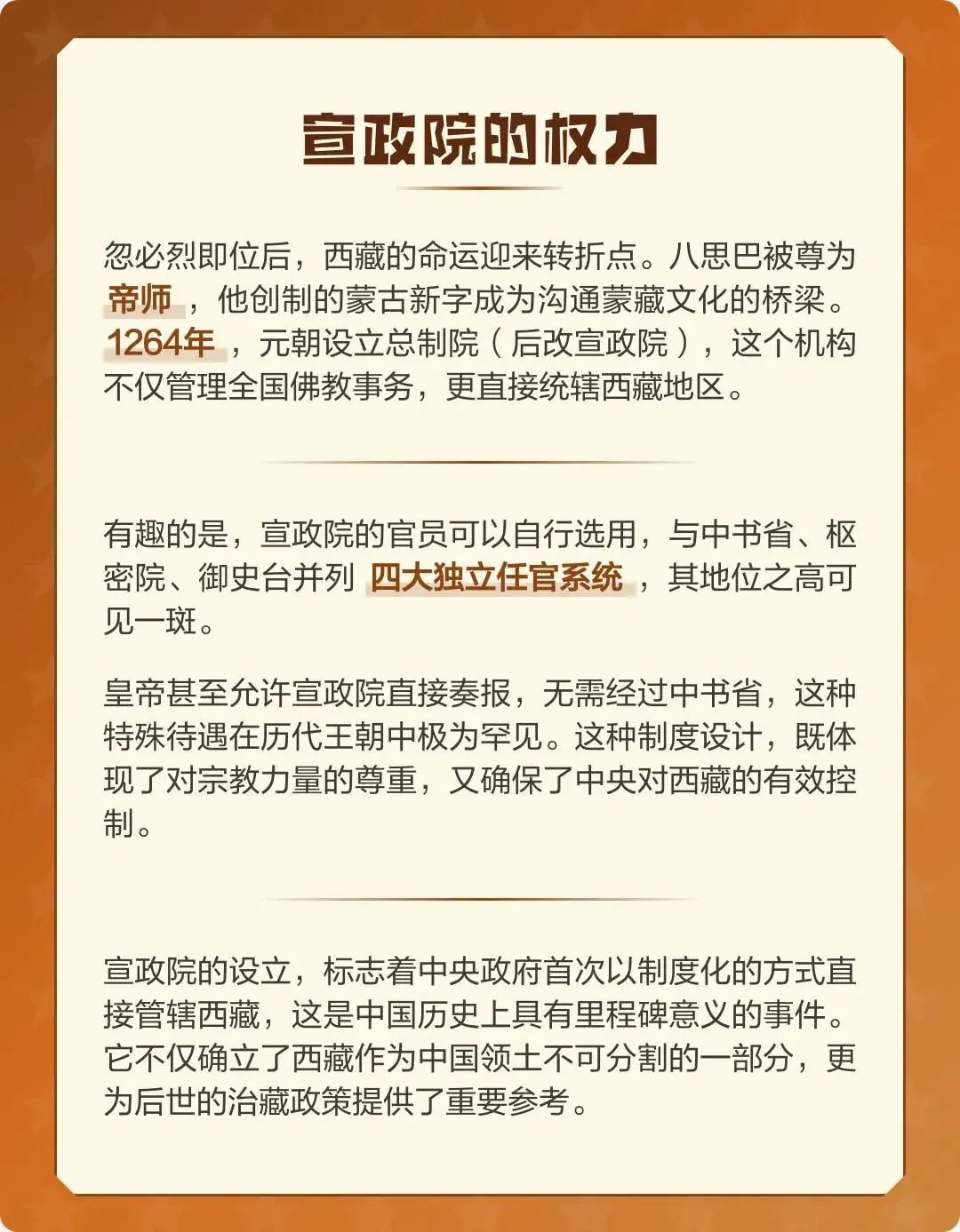 八思巴主持设立27个大驿站,连接青海与萨迦,保障政令通达、军队调度与赋税运输。这不仅强化了中央对西藏的实际控制,也促进了汉藏经济文化交流,使边疆真正融入国家治理网络。
