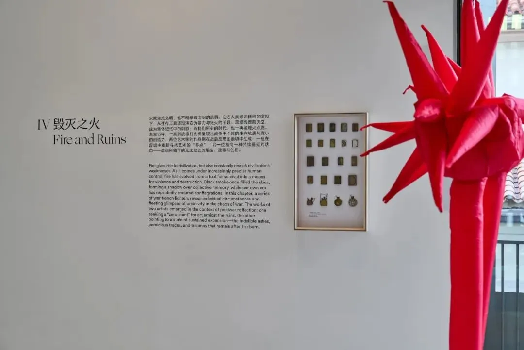 本章节中,一系列战壕打火机呈现出战争中个体的生存境遇与微小的创造力,两位艺术家的作品则在战后反思的语境中生成:一位在废墟中重新寻找艺术的“零点”,另一位指向一种持续蔓延的状态——燃烧所留下的无法散去的烟尘、遗毒与创伤。