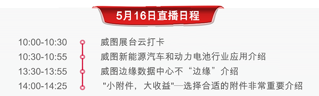 值得期待的是,为了全面展示本次威图展位亮点,展会首日(16日)将为用户带来精彩的展位同步云直播。让您不用亲临现场也可以重磅了解威图电池行业解决方案!