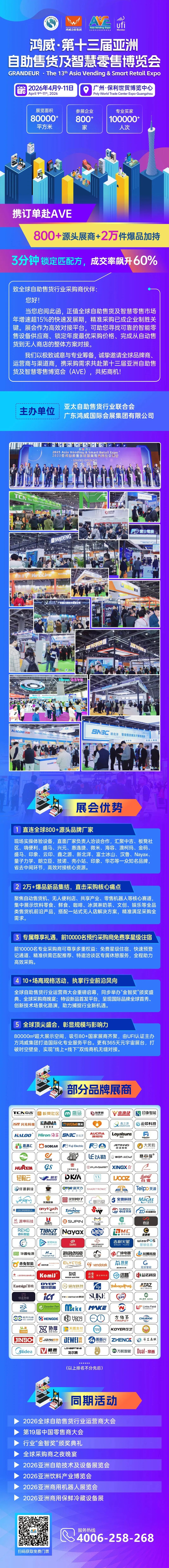 4月9日,备受全球瞩目的2026第十三届亚洲自助售货及智慧零售博览会(AVE)在广州·保利世贸博览馆盛大开幕。本届博览会将联袂“中国零售商大会暨广州国际零售商业智能设备与商品博览会、2026亚洲乳业博览会暨广州鲜奶节、亚洲商用保鲜冷藏设备展”等系列主题展会一同展出,并作为"广货行天下"系列活动的重要组成部分,覆盖自助售货、无人店、共享设备、零售机器人全产业链。“广货行天下"是2025年底至2026年初省委、省政府作出的工作部署,旨在推动企业拓市场、拿订单。鸿威会展与中国商业联合会合作,以市场化方式积极导入省外及境外采购资源,搭建零售商业智能设备及商品供需对接平台,助力广东相关行业企业扩大品牌宣传、拓展市场。