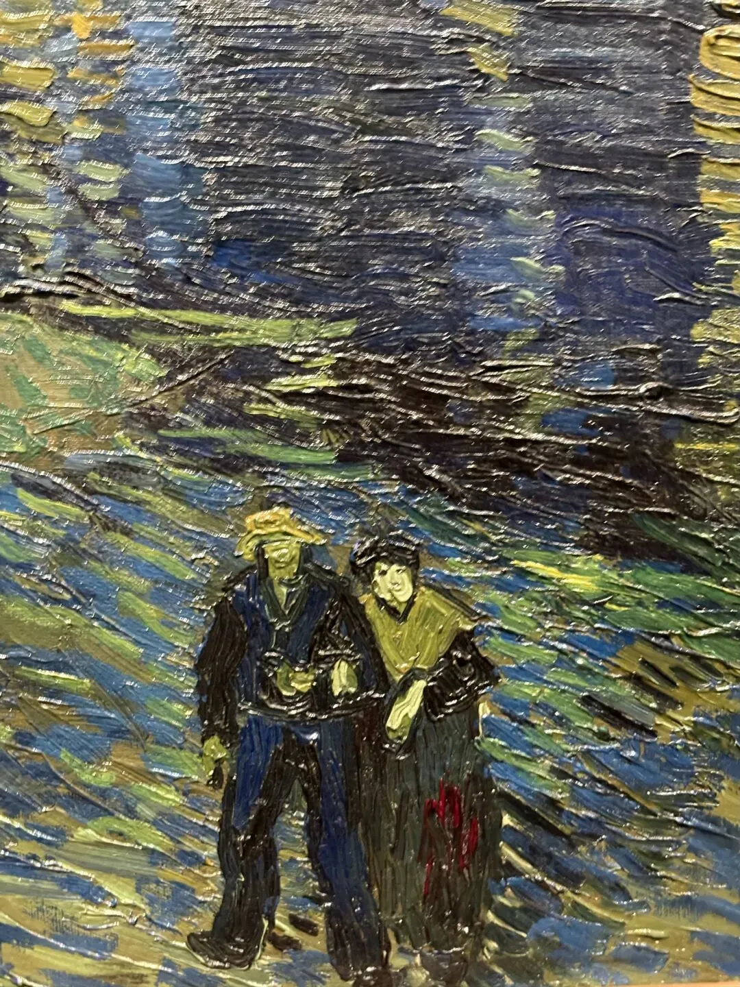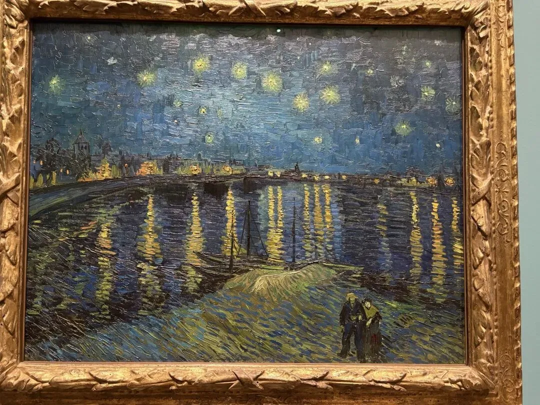 “终于画成了星空——真正在夜晚的煤气灯下绘就”,梵高如此描述这幅从罗讷河对岸眺望阿尔勒的景色。尽管作品主要是在户外实时写生完成,他仍通过构图上的精心安排以实现理想效果:将北斗七星置于场景上空,并虚构了前景中的恋人。这对恋人的存在对他将这幅作品定位为‘诗意主题’的构想至关重要。