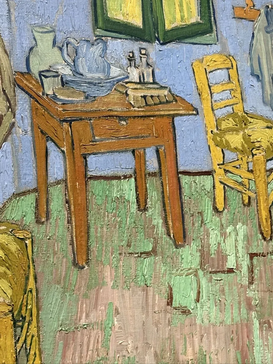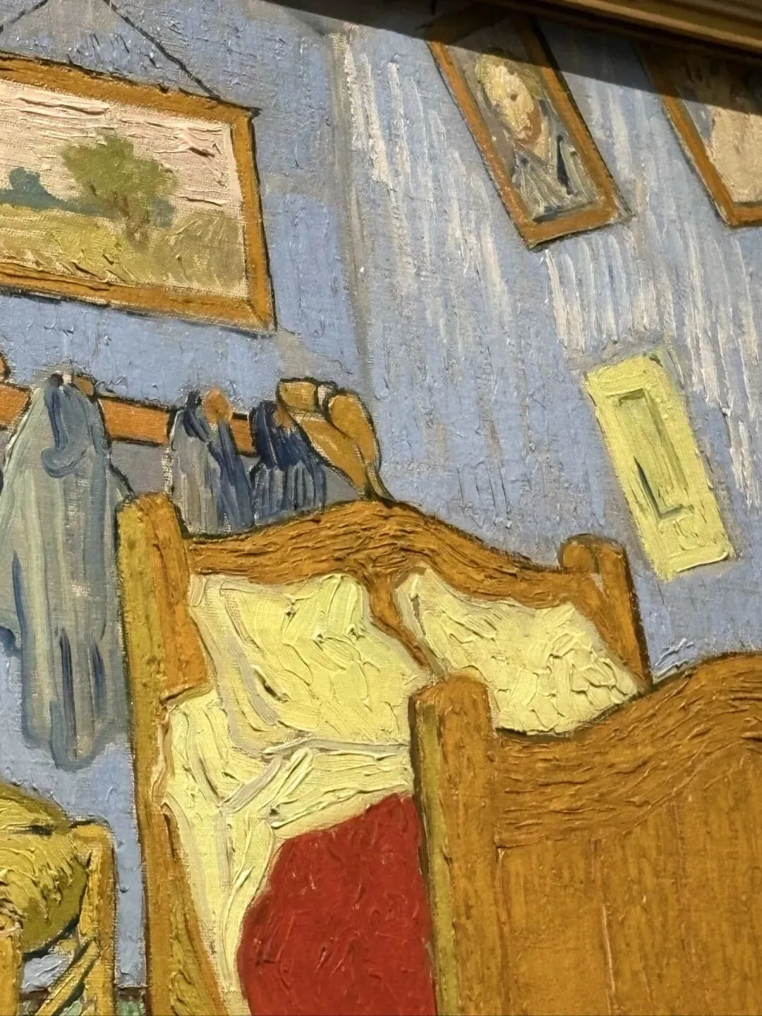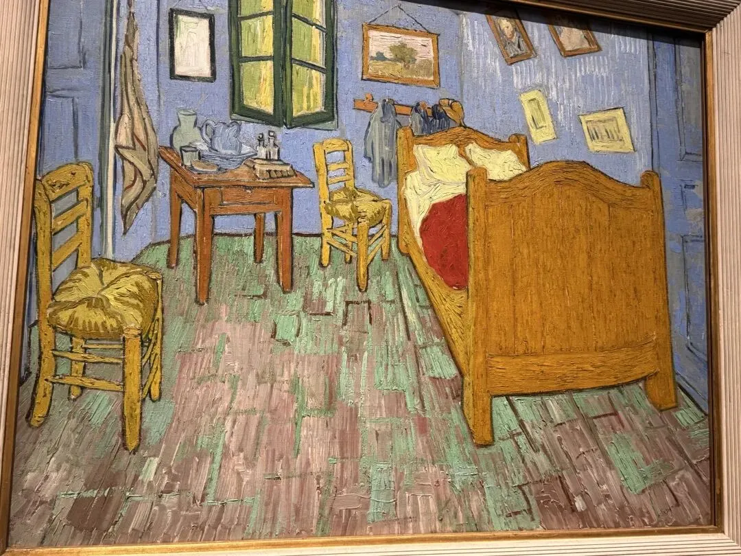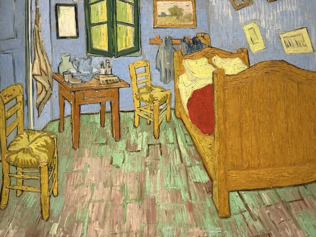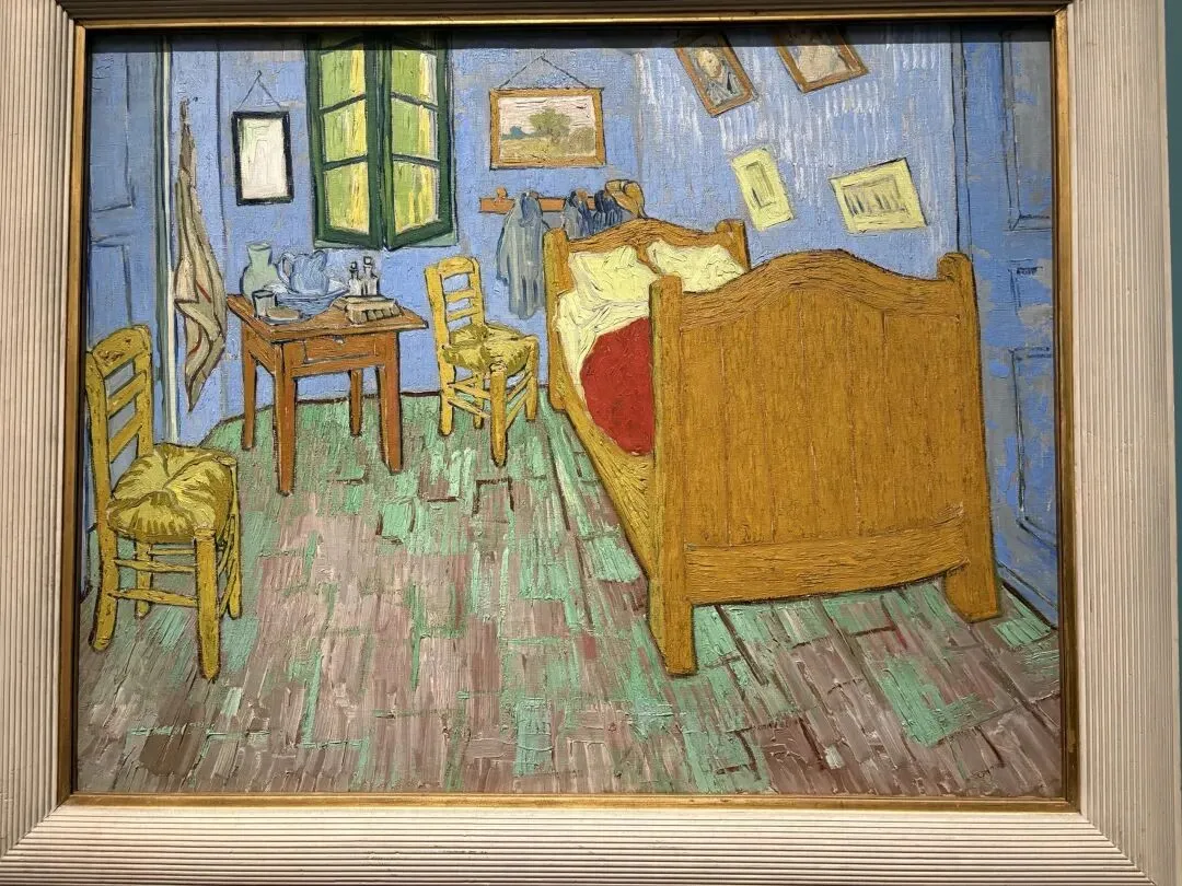 黄房子的装饰中包含梵高的卧室。此作为三版本中的第二幅,于1889年9月在圣雷米绘制,展现了他对墙上艺术作品陈列的想象性调整:在床的上方,他将初版中可见的《诗人》(NO.3)替换为近期创作的自画像(NO.26),并将旁边悬挂的《恋人》(NO.1)更换为一幅未知身份的女士肖像。他对画面的选择或许表达了对爱与陪伴的深切渴望。