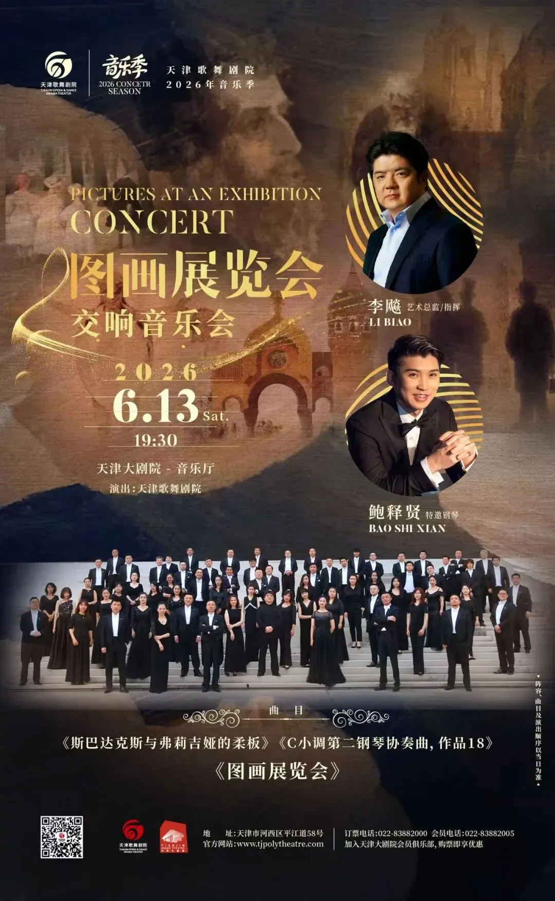 2026年6月13日 19:30,“图画展览会”交响音乐会将登陆天津大剧院音乐厅。由天津歌舞剧院艺术总监、著名指挥家李飚倾情执棒,联袂天津歌舞剧院管弦乐团,特邀雅马哈艺术家、青年钢琴家鲍释贤加盟,以三首殿堂级名作,打造一场震撼人心的交响盛宴。将以三部横跨不同国度与时代的交响杰作,为津门乐迷铺展一幅波澜壮阔的音乐画卷。