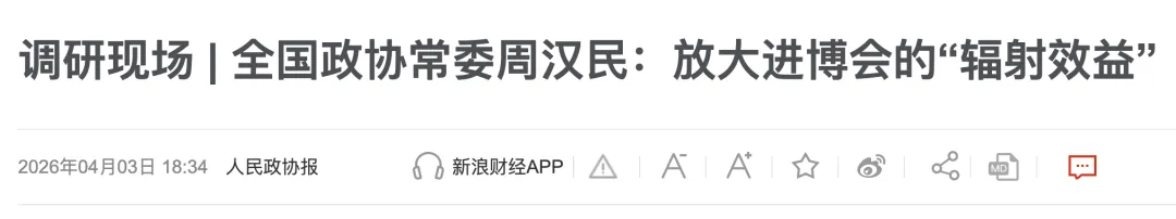 全国政协 “推动贸易创新发展,加快建设贸易强国” 调研组于4月1日走进中国国际进口博览局,调研进博会助力贸易创新发展的实践举措。作为进博会 “全勤生” 的全国政协常委、上海公共外交协会会长、丝路智谷研究院高级顾问周汉民,全程见证进博会 8 年发展,不仅细数进博会带来的贸易发展成果,还结合新形势为第九届进博会及后续发展建言献策,提出多项放大进博会辐射效益的具体建议。