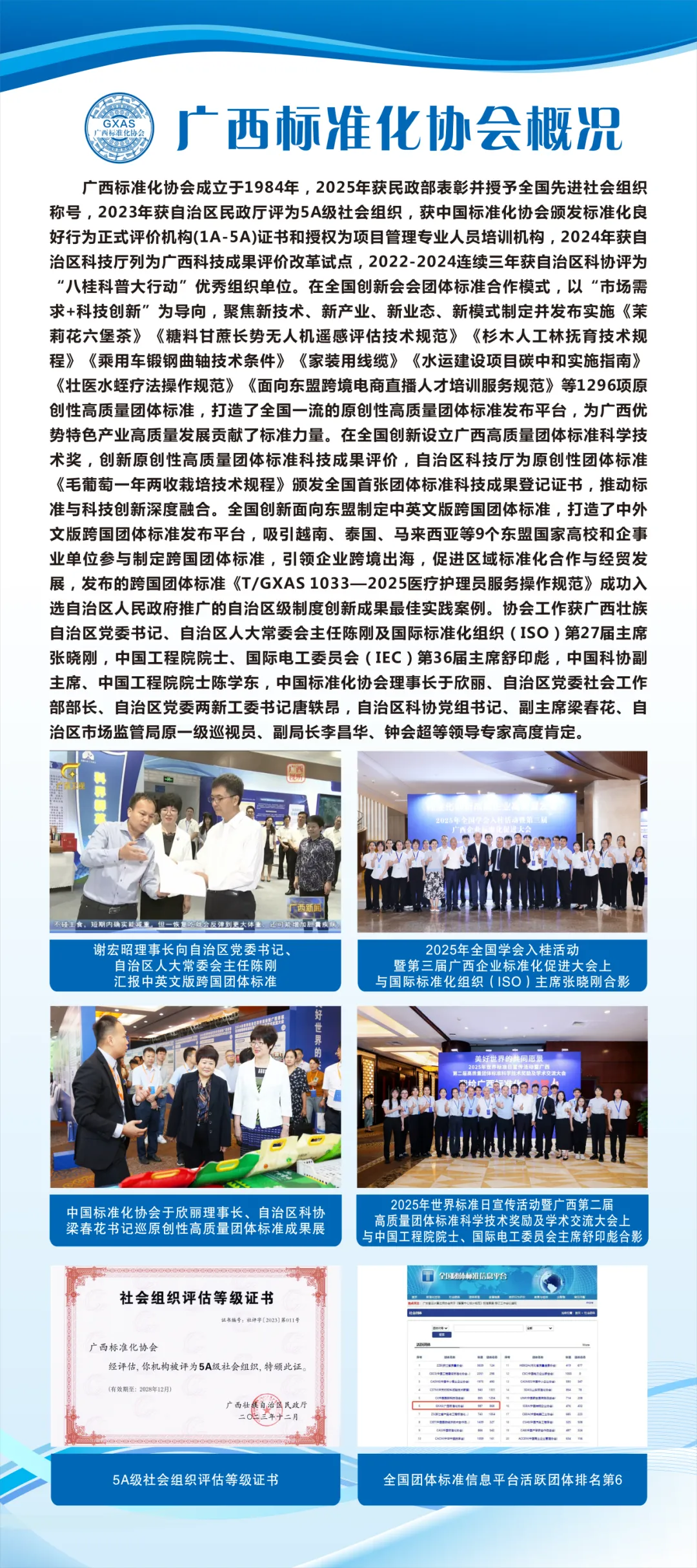 广西标准化协会提供国家标准、地方标准、团体标准、企业标准研制、标准化良好行为创建与评价、标准化试点示范项目创建等全过程指导和服务,以及CSPM等级证书培训: