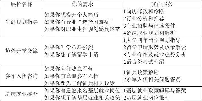 为给2023届毕业生们提供更多更加优质以及全面的就业指导,此次招聘会不仅设立了企业招聘展位,还特别设立了生涯规划指导、境外升学交流、参军入伍咨询、基层就业推介等四个板块的服务展位。这里有企业资深职业规划师、经验丰富的海外留学咨询人员、基层就业指导工作者、学校专业征兵工作专员与同学们面对面交流,针对同学们提出的问题进行专业性的解答消除疑惑,全方位多角度地契合毕业生的多种就业需求,让同学们在前进的道路上不再迷茫,为毕业生未来发展提供更有意义的平台以及提供更多指导性建议,让毕业生在更多领域发光发热。