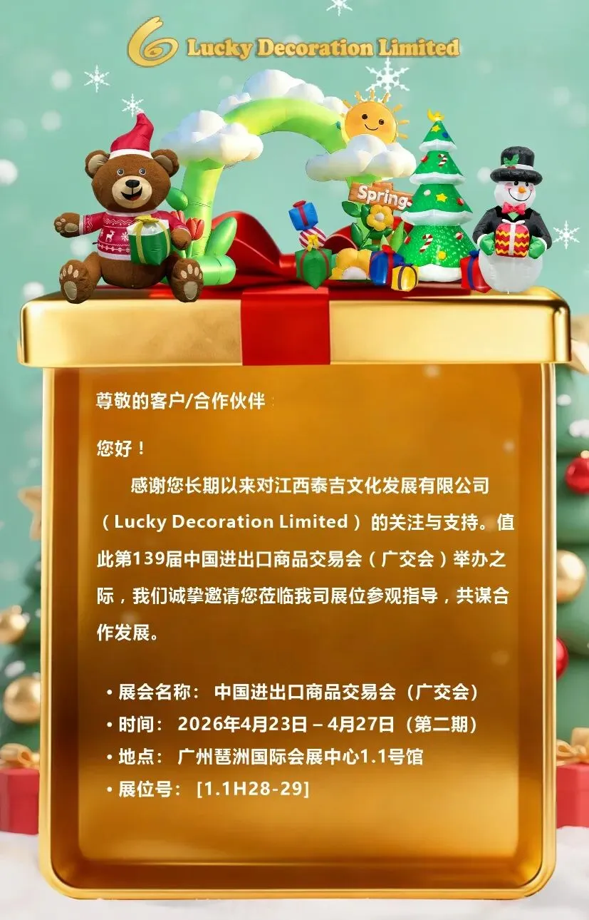 江西泰吉文化发展有限公司(Lucky Decoration Limited)专注于文化创意及装饰充气产品的研发与销售,致力于为客户提供高品质、富有设计感的装饰解决方案。本次展会将展出我们最新的产品系列,期待与您现场交流。
