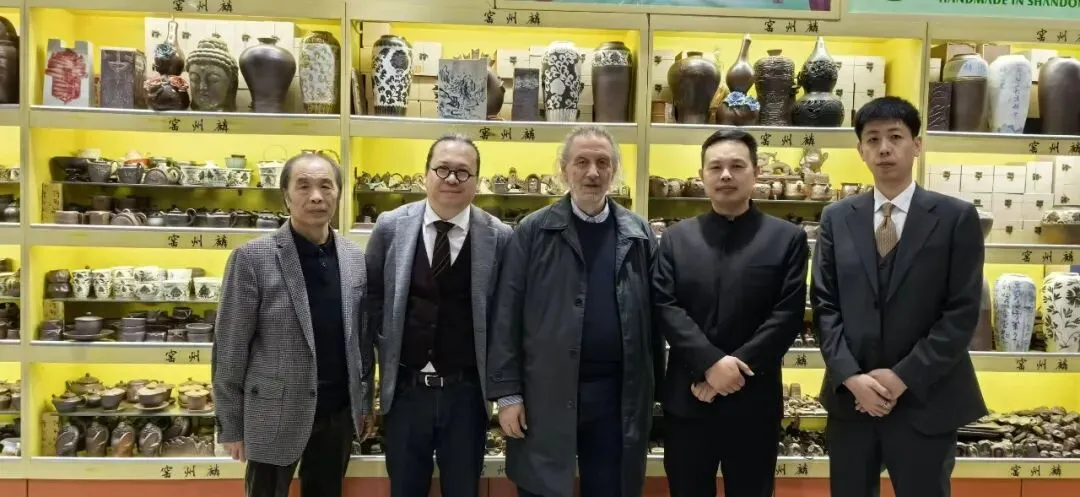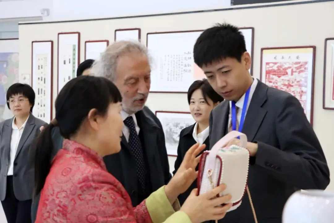 活动当日,嘉宾们首先观看了学院宣传片,随后依次参观了工笔牡丹画、剪纸、柴烧陶艺、篆刻等特色展位。一幅幅笔触细腻的工笔牡丹画、一件件构思精巧的文创产品,引得嘉宾频频驻足。意大利国立罗马美术学院终身教授、前学术委员会主席朱塞佩・第・劳伦佐(Giuseppe Di Lorenzo)教授在现场评价道:“学院把一门传统技艺做成了一个完整的教育体系和产业链条,这对非遗传承都有借鉴意义。”活动前一日,嘉宾们还专程前往非遗传承人蒋继涛的工作室,近距离观摩了传统陶艺的创作过程。