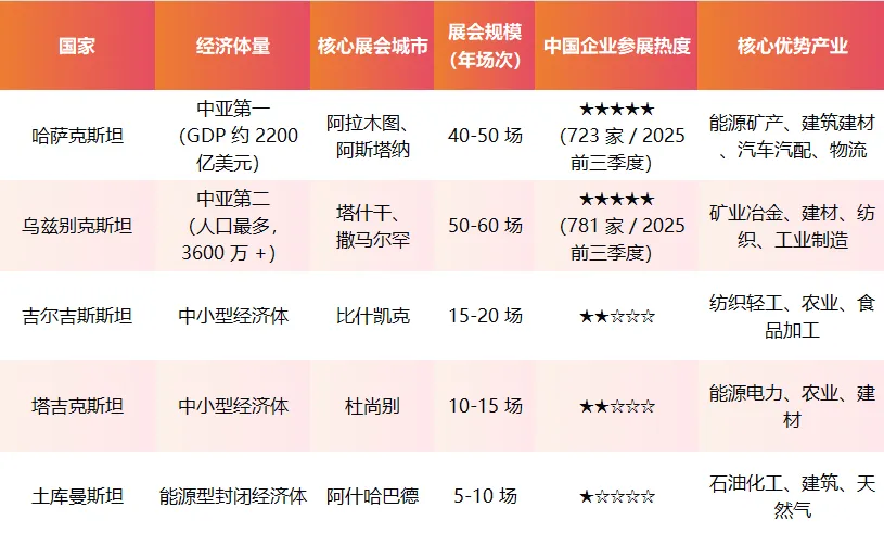 乌兹别克斯坦、哈萨克斯坦为第一梯队:展会多、规模大、中国企业扎堆,竞争激烈但机会最多; 吉尔吉斯、塔吉克斯坦为第二梯队:展会小众、精准,适合细分领域突围;土库曼斯坦为第三梯队:封闭性强,仅适合能源、基建领域企业布局。