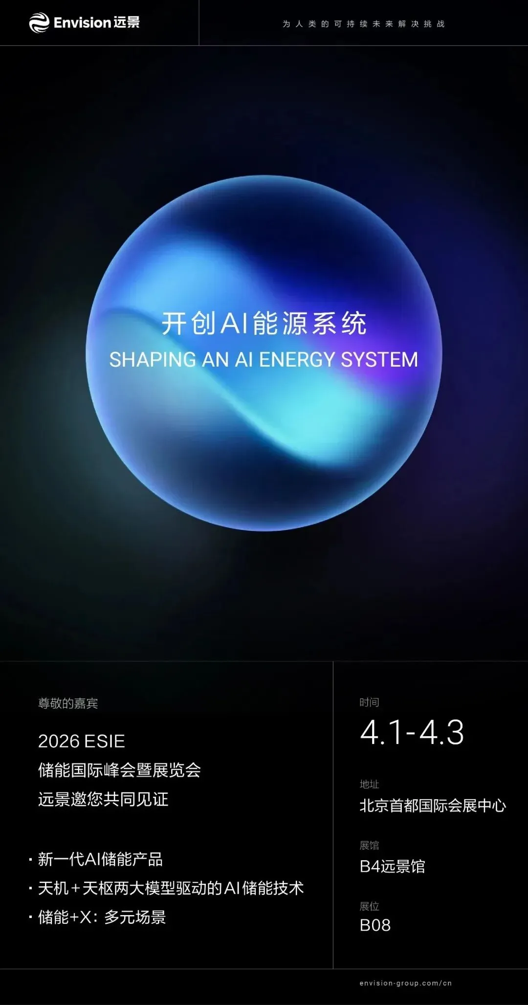 远景储能的审美,在业内一直很“能打”。官网、PPT、画册、海报,每一件都透着淡淡的高级感;产品名字也让人过目不忘——“天机”“天枢”。这次在ESIE中关村储能展上,远景依然以“AI”为题眼,带来了五件值得细说的作品。