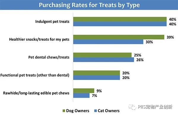 尽管通货膨胀,宠物父母仍继续购买各种宠物产品,认为它们对宠物饲养更为重要。其中包括宠物食品,它们已经显著扩展到各种类型。根据Packaged Facts的数据,各类宠物食品的购买率都是全面的。例如,40%的猫父母和狗父母都会购买非刚需宠物食品,而只有7%和9%的人会购买生皮或其他形式的长效咀嚼物。